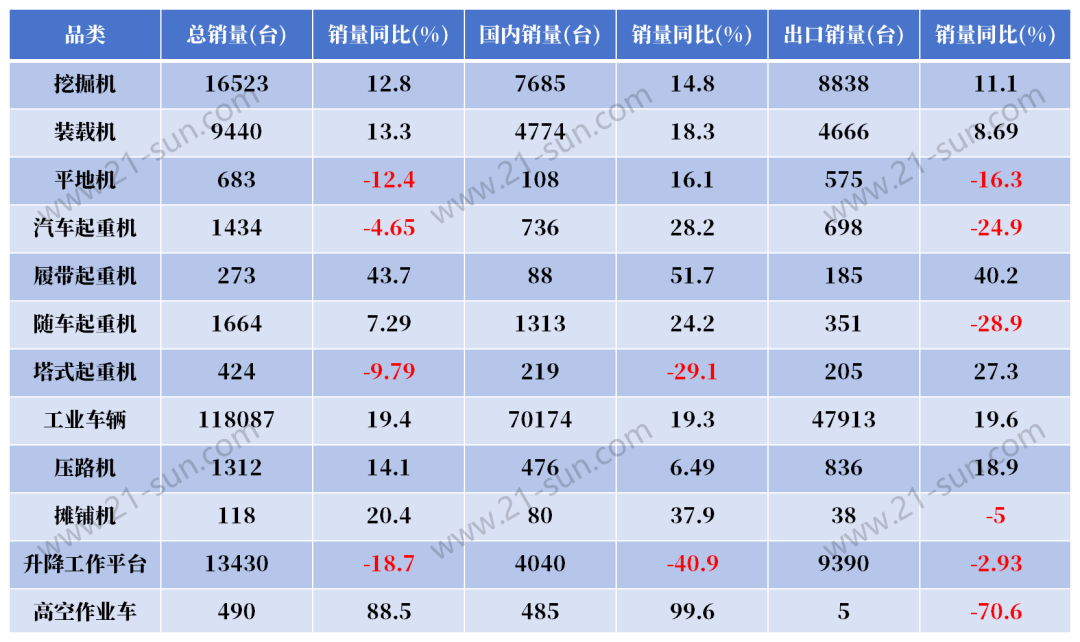 挖掘机、装载机作为职业两大主力产品,别离完成了12.81%和13.3%的同比增加,高空作业车销量同比激增88.5%,履带起重机销量同比增速超40%,摊铺机连续稳健态势,增幅超20%;塔式起重机、升降作业渠道跌势有所平缓,同比降幅收窄至20%以内。