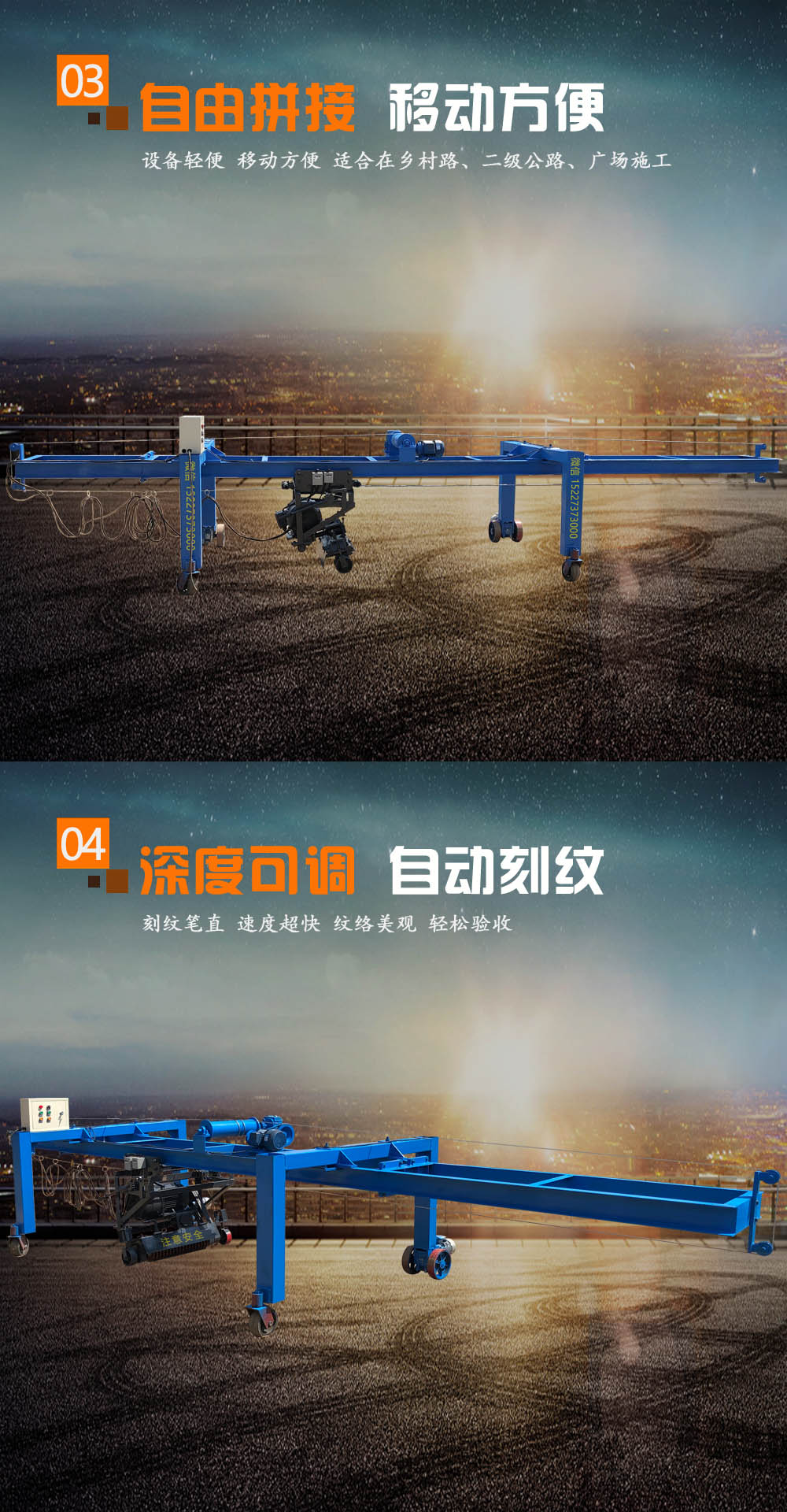 仿形轮,超长悬挂式导轨,刻纹深度不受路面拱度影响。施工宽度内无接缝,切开方向能调整,确保顺直度。运转程度均衡压力水冷却,大幅度节约锯片,可变速切开。依据路面要求,结构可随意加长。配有主动行走设备,更省人工,进步作业效率。